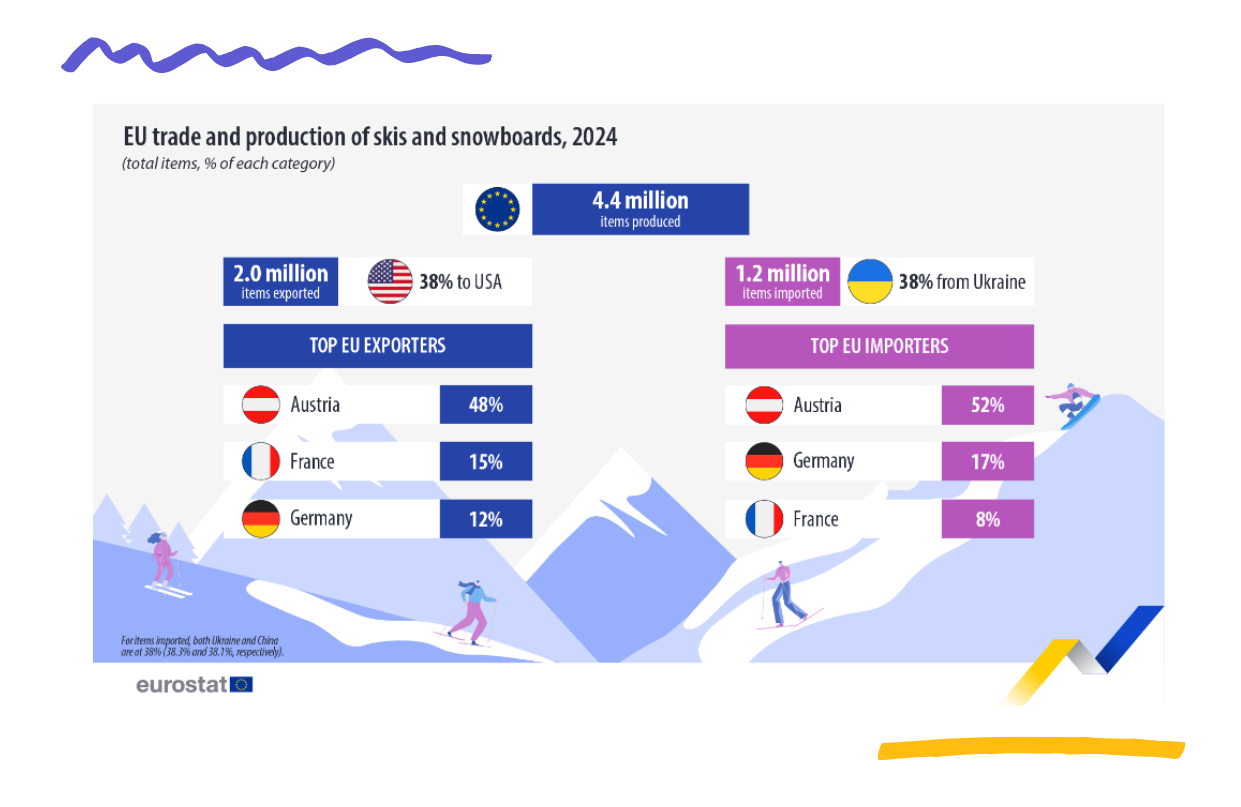 ⛷️ L’UE ha prodotto 4,4 milioni di paia di sci e snowboard nel 2024, una cifra in calo del 19% rispetto al 2023 e quasi il 40% di questi articoli (1,7 milioni) sono stati prodotti in Austria